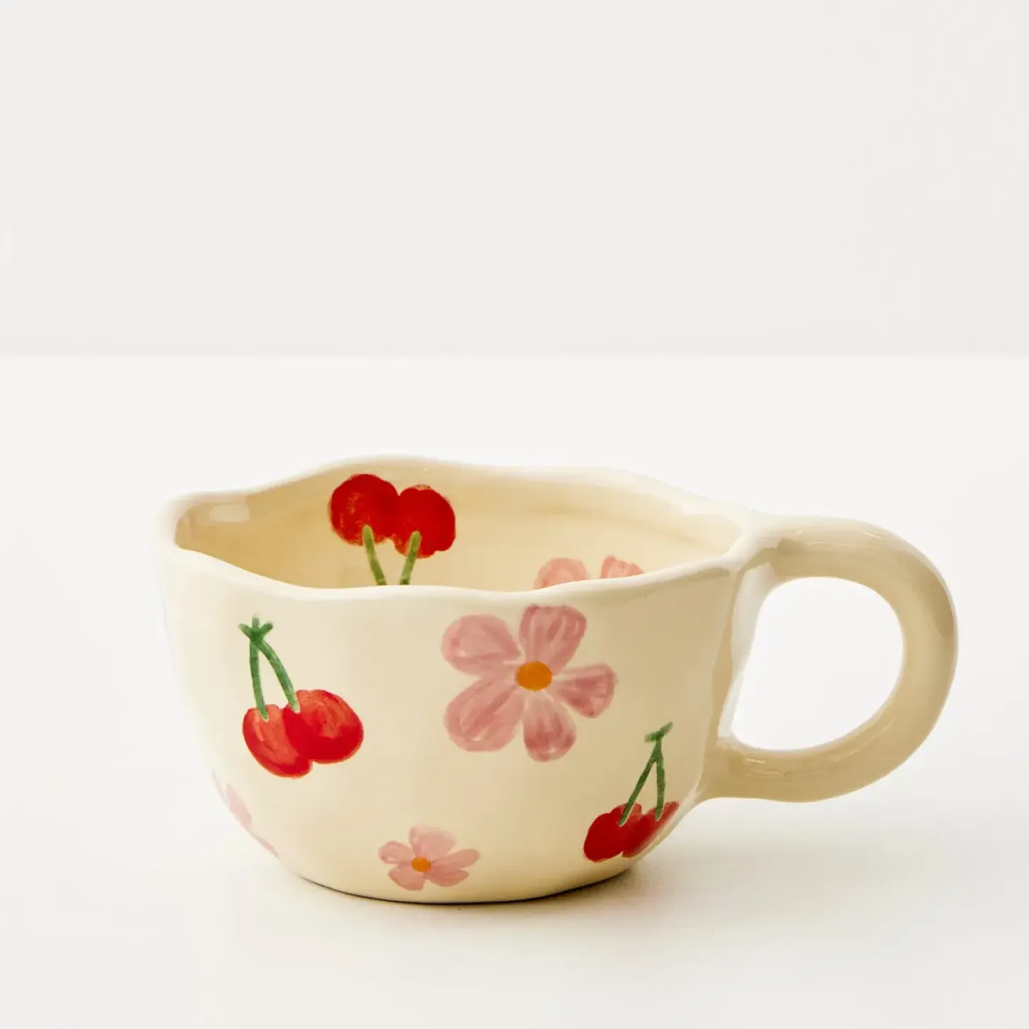 Embrace Vintage-Core With This Arty, Hand-Painted Ceramic Mug In Pale Buttercup Yellow Glazed Ceramic With Floral And Cherry Pattern. Perfect For Afternoon Tea And Your Favourite Biccie.