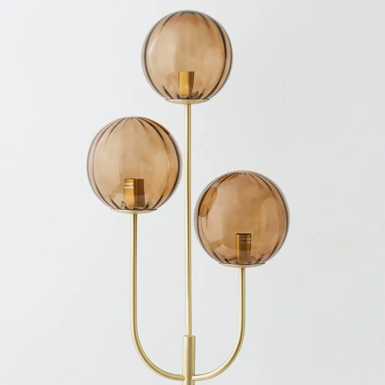 Ideal For Adding Some Stylish Illumination To Any Living Space, The Trident Metal Floor Lamp Is Made From High-Quality Metal With A Stylish Gold Matte Finish, Supporting Three Orb-Shaped Amber Tinted Glass Baubles For Maximum Light.
