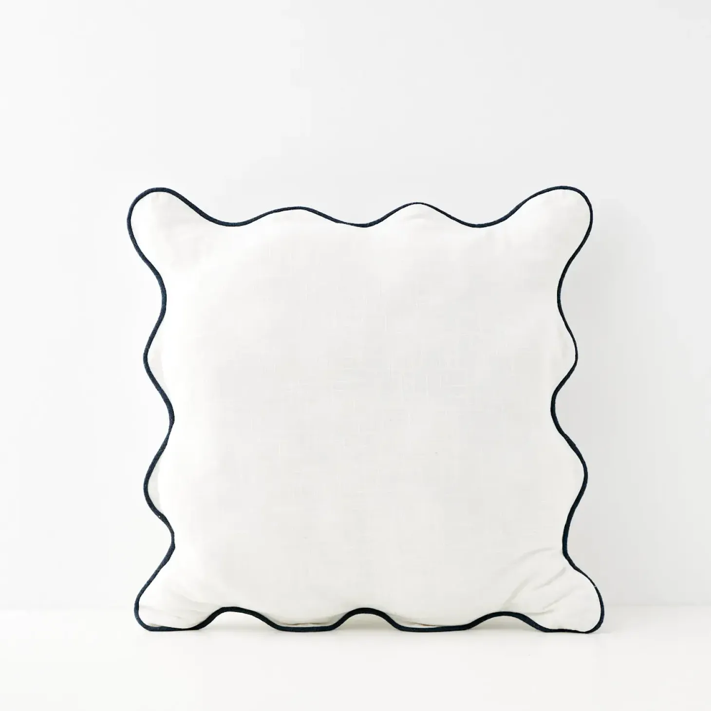 A Delicate Scalloped Edge Is An Easy Way To Add A Unique Twist To Classic Interior Pieces Like This White Cotton Accent Cushion With Scalloped, Navy Trim For A Hamptons Chic Aesthetic.