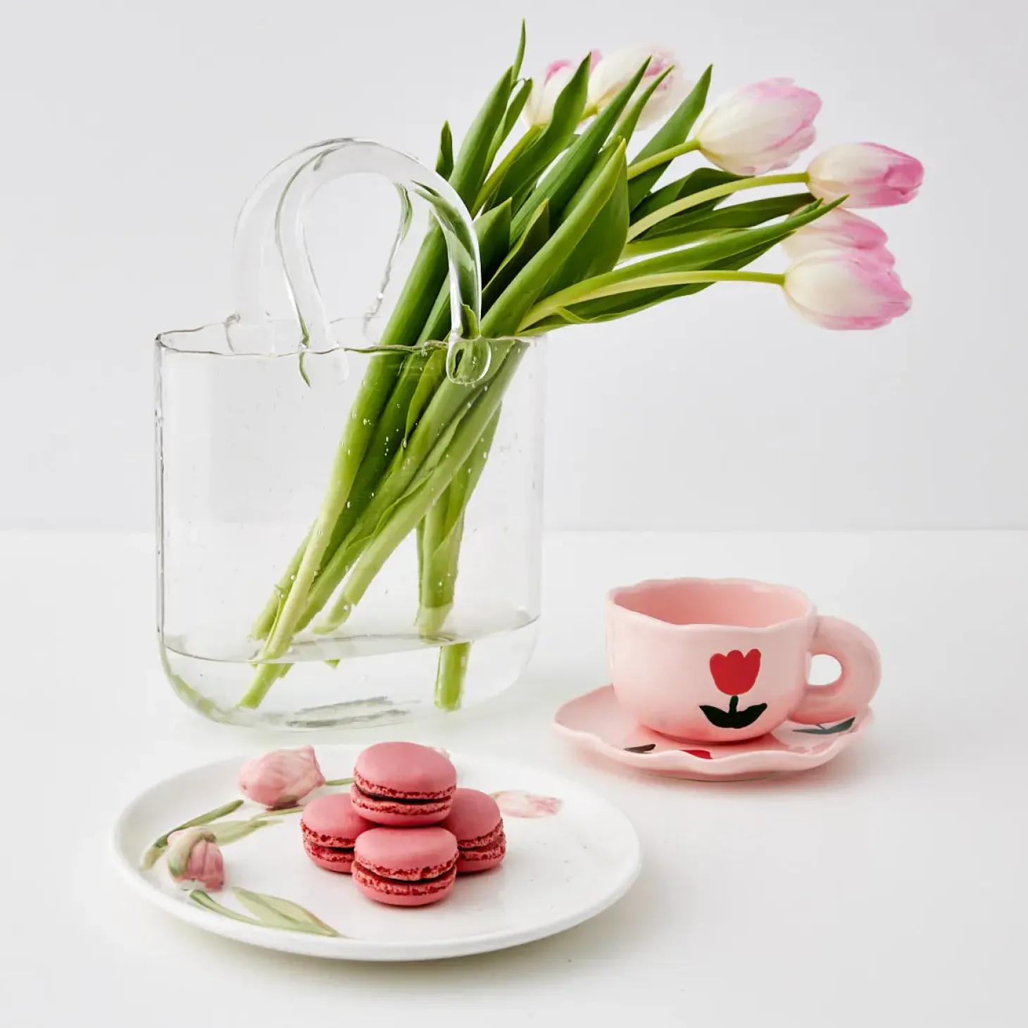 Fall In Love For Floral Ceramics With This Pretty In Pink Glazed Cup And Saucer Set In Baby Pink With Blossoming Red Tulip Floral Pattern. Tea Is Served!