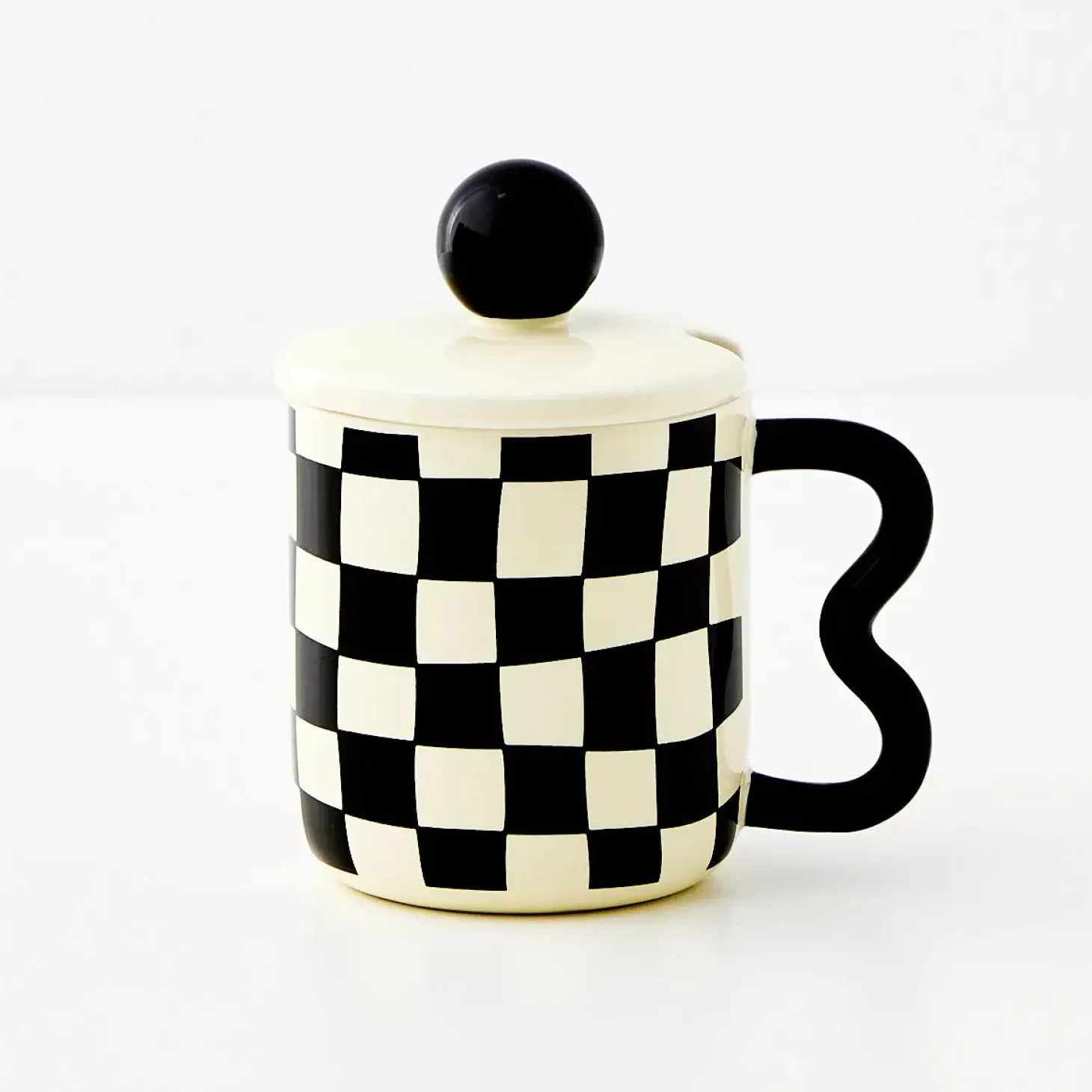 Keep Calm And Coffee On With This Playful Artsy-Crafty Black And Whited Check Ceramic Mug With Matching Ceramic Lid To Keep Your Brew Hotter, For Longer.