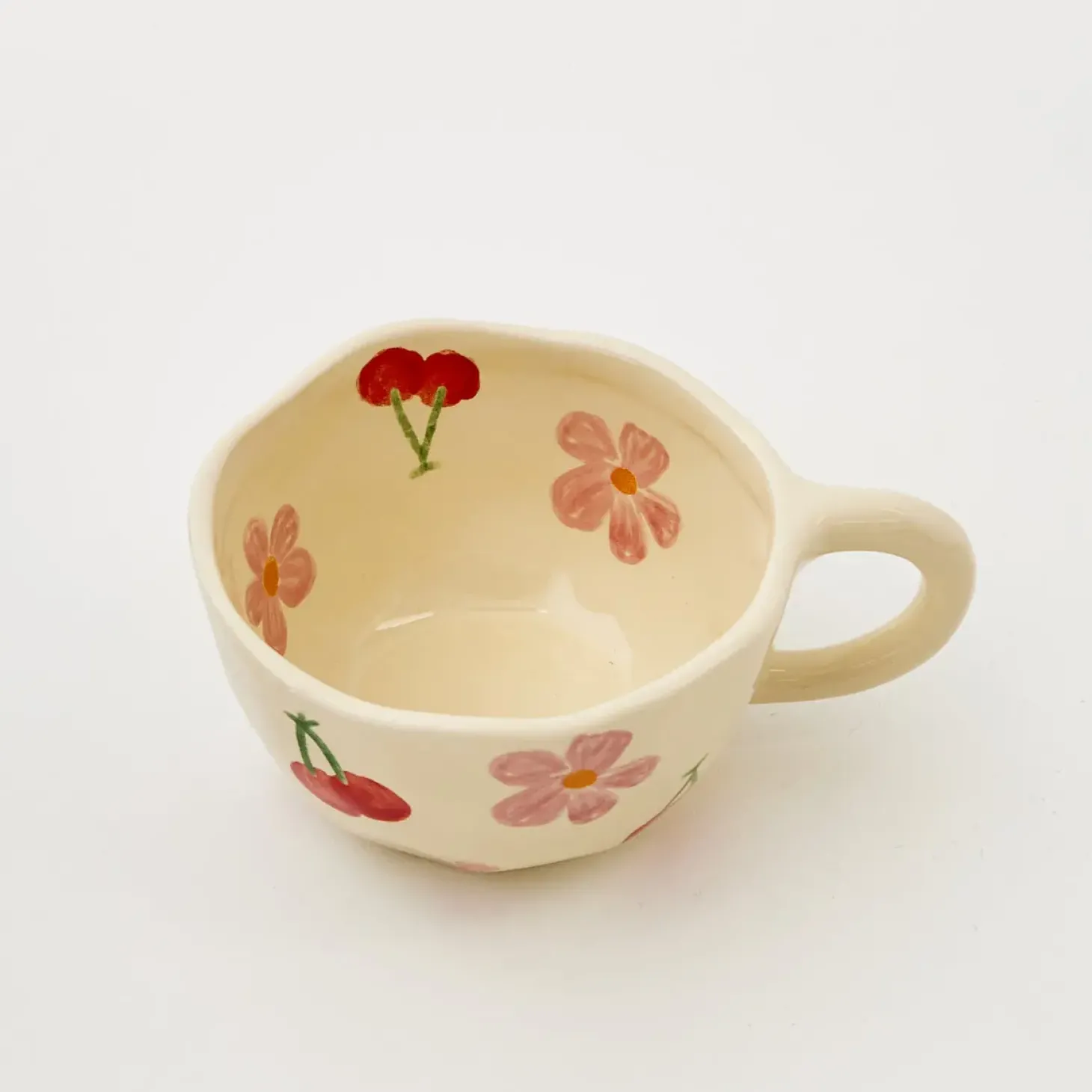 Embrace Vintage-Core With This Arty, Hand-Painted Ceramic Mug In Pale Buttercup Yellow Glazed Ceramic With Floral And Cherry Pattern. Perfect For Afternoon Tea And Your Favourite Biccie.