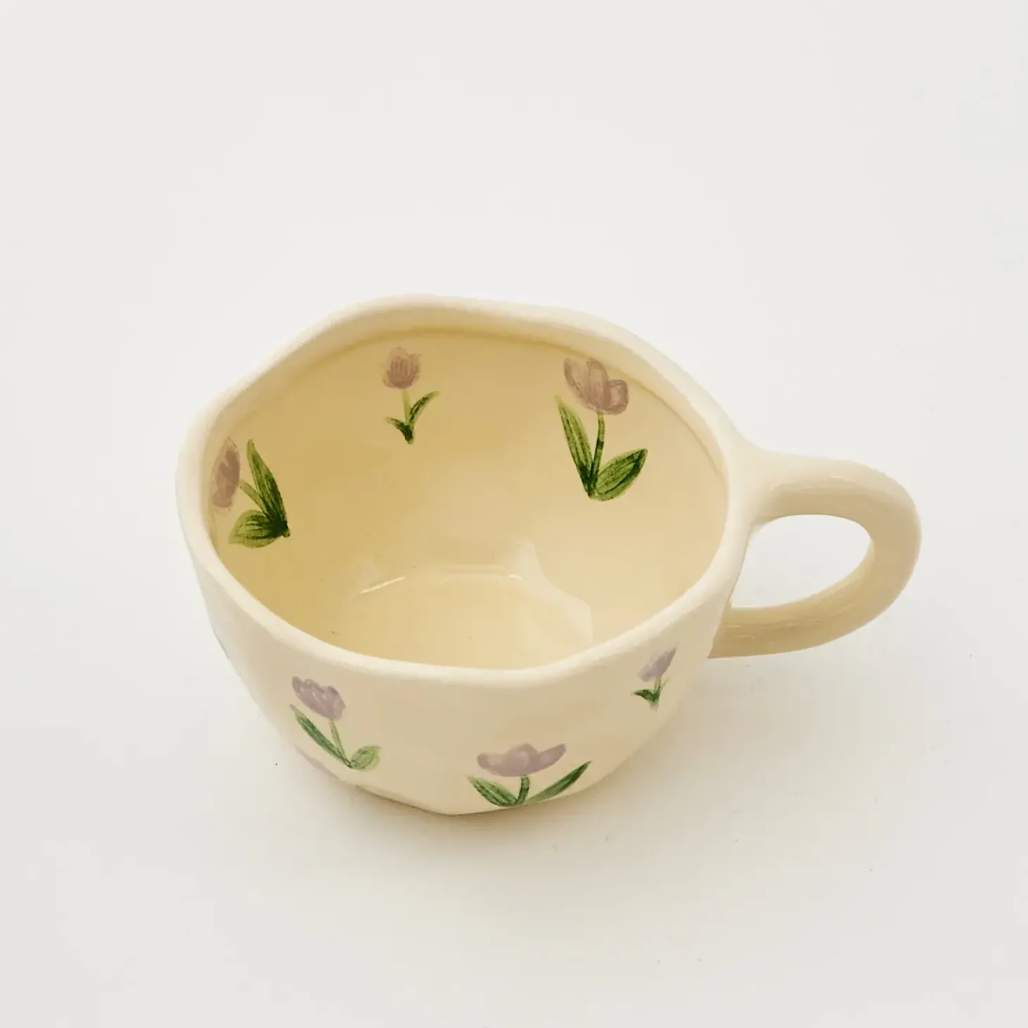 Embrace Vintage-Core With This Arty, Hand-Painted Ceramic Mug In Pale Buttercup Yellow Glazed Ceramic With Floral Lilac Tulip Pattern. Perfect For Afternoon Tea And Your Favourite Bickie.