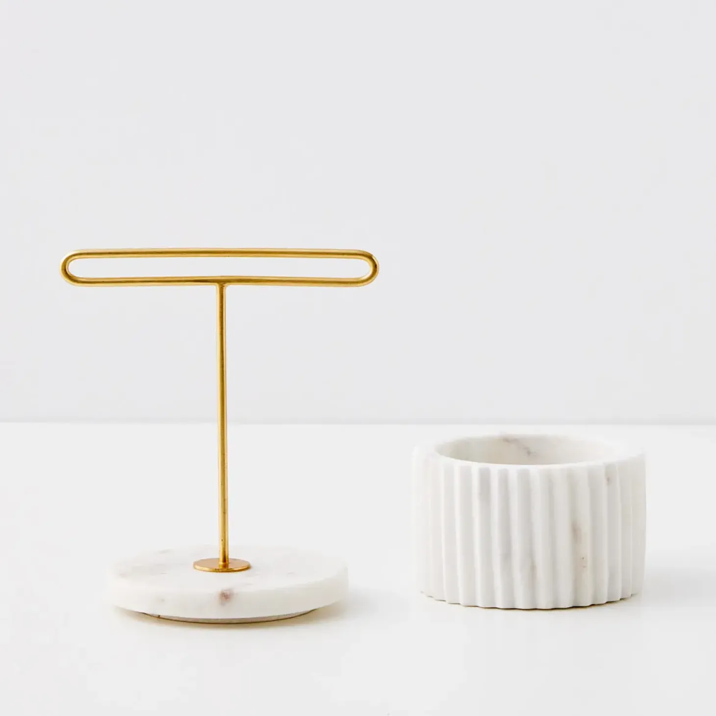 Keep Your Jewels Safely Stored And Dust-Free In This Chic Two-Piece White Marble And Gold Jewellery Stand With Hanging Area For Necklaces And Trinket Dish For Rings, Pins And Smaller Pieces.
